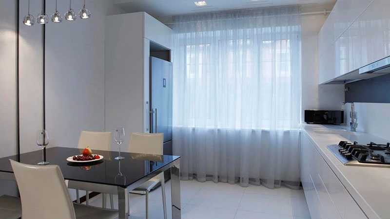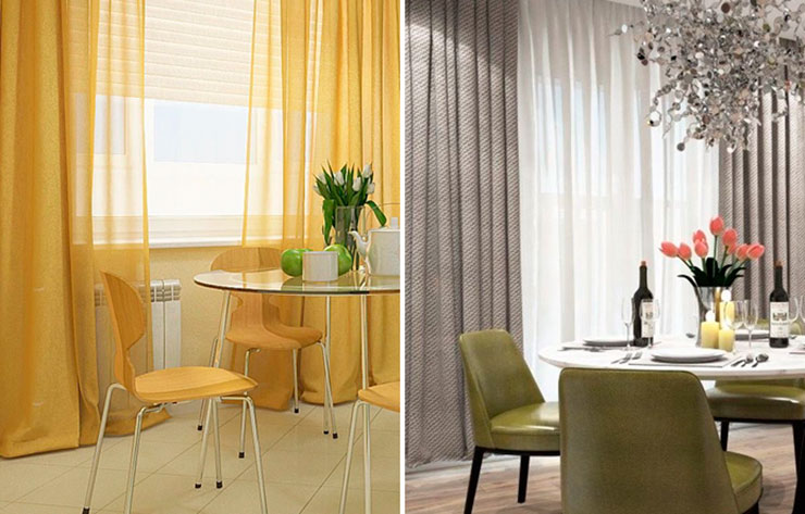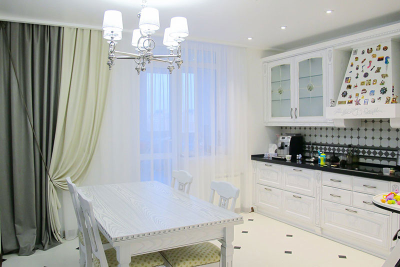 Если кухня просторная, с высокими потолками и большими окнами, то можно себе позволить длинные струящиеся шторы. Они добавят интерьеру лёгкости, изящества и создать мягкий вертикальный акцент. Важно не переборщить с объёмом ткани, драпировки должны быть естественными, без лишней помпезности. В последнее время дизайнеры всё чаще и чаще рекомендуют обратить внимание на комбинированные варианты. Например, лёгкий тюль в паре с короткими рулонными шторами.