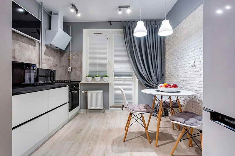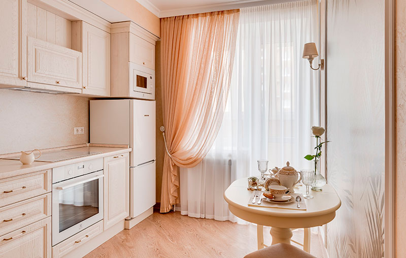 Также при выборе штор важно обратить внимание на их длину. Она должна быть такой, чтобы окно выглядело гармонично и не выбивалось из общей композиции интерьера. Правильно подобранная длина делает помещение визуально аккуратнее и помогает сохранить баланс между функциональностью и эстетикой. Особенно это актуально для небольших кухонь, где каждый сантиметр пространства имеет значение. Здесь длинные до пола шторы могут смотреться громоздко и утяжелять интерьер. Оптимальным решением станут короткие занавески до подоконника или чуть ниже – они не мешают пользоваться рабочей поверхностью и не создают ощущение тесноты.