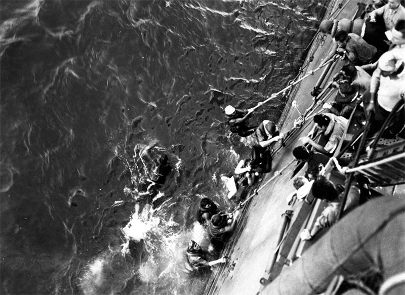 Выживших моряков разметало по океану на площади более 250 квадратных километров. Только часть из них успела надеть спасательные жилеты. Кому-то повезло найти в воде плоты, и они смогли взобраться на них. В течение ночи многие тяжелораненые погибли, часть моряков находилась в бреду, наглотавшись разлитого топлива с поверхности воды. А новый день встретил экипаж палящим солнцем, которое доводило измученные организмы до полного изнеможения.