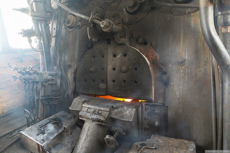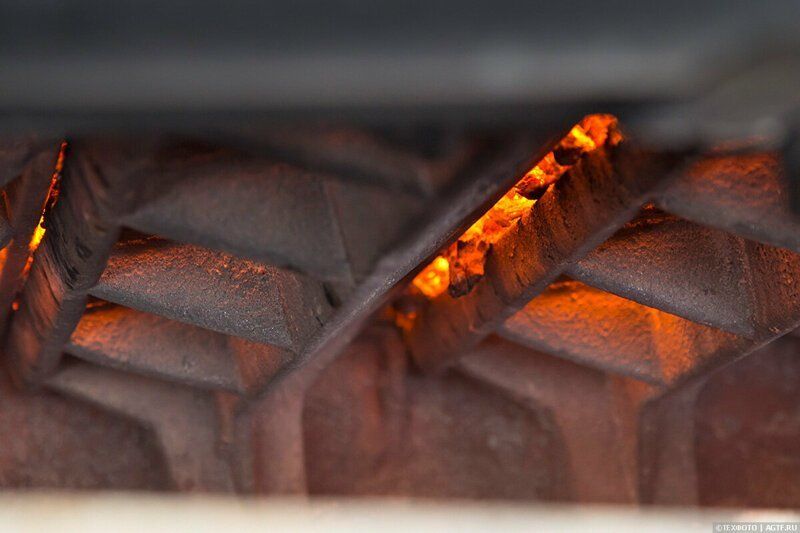 Если заглянуть снизу, то можно понаблюдать за процессом горения угля через колосниковые решетки топки.